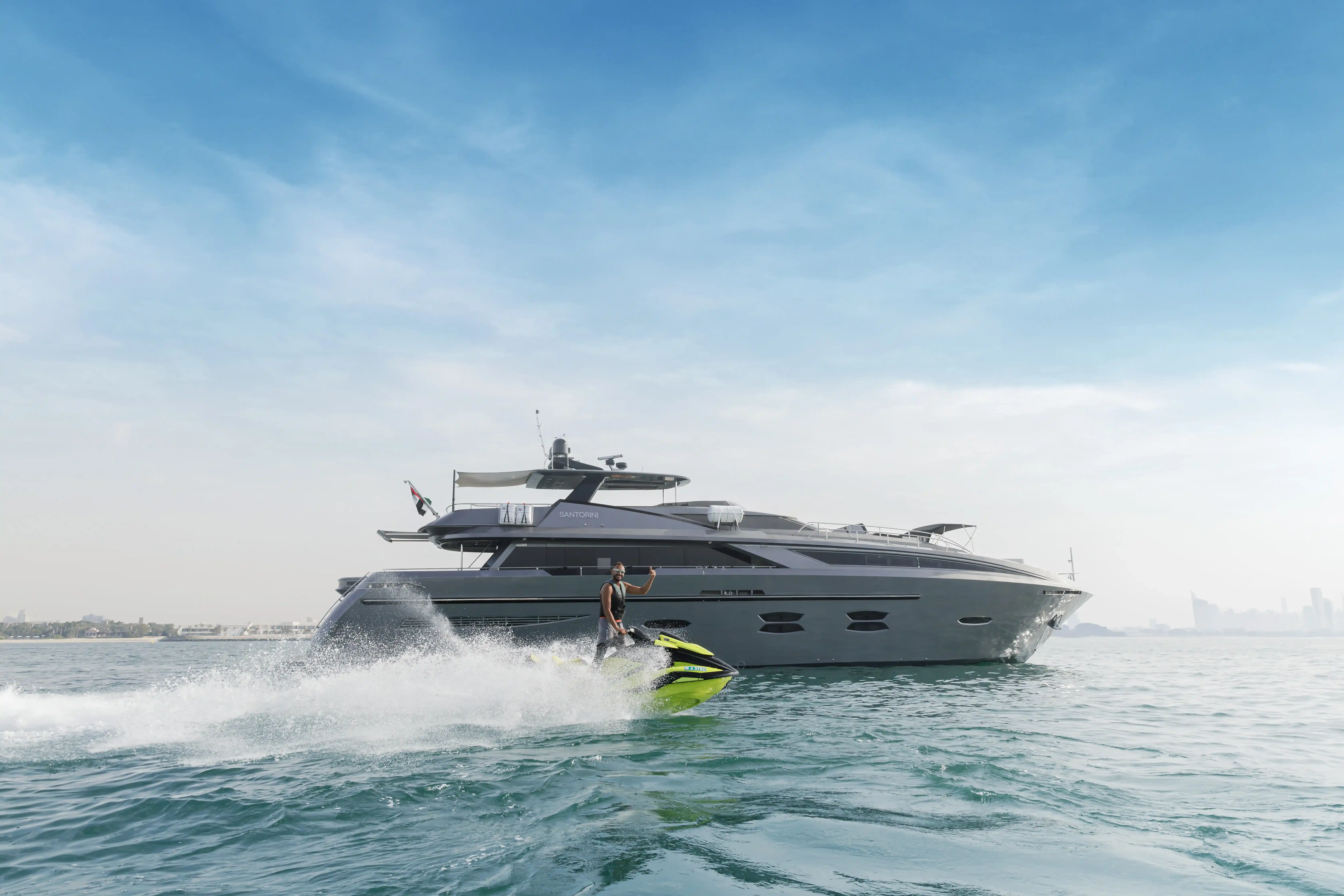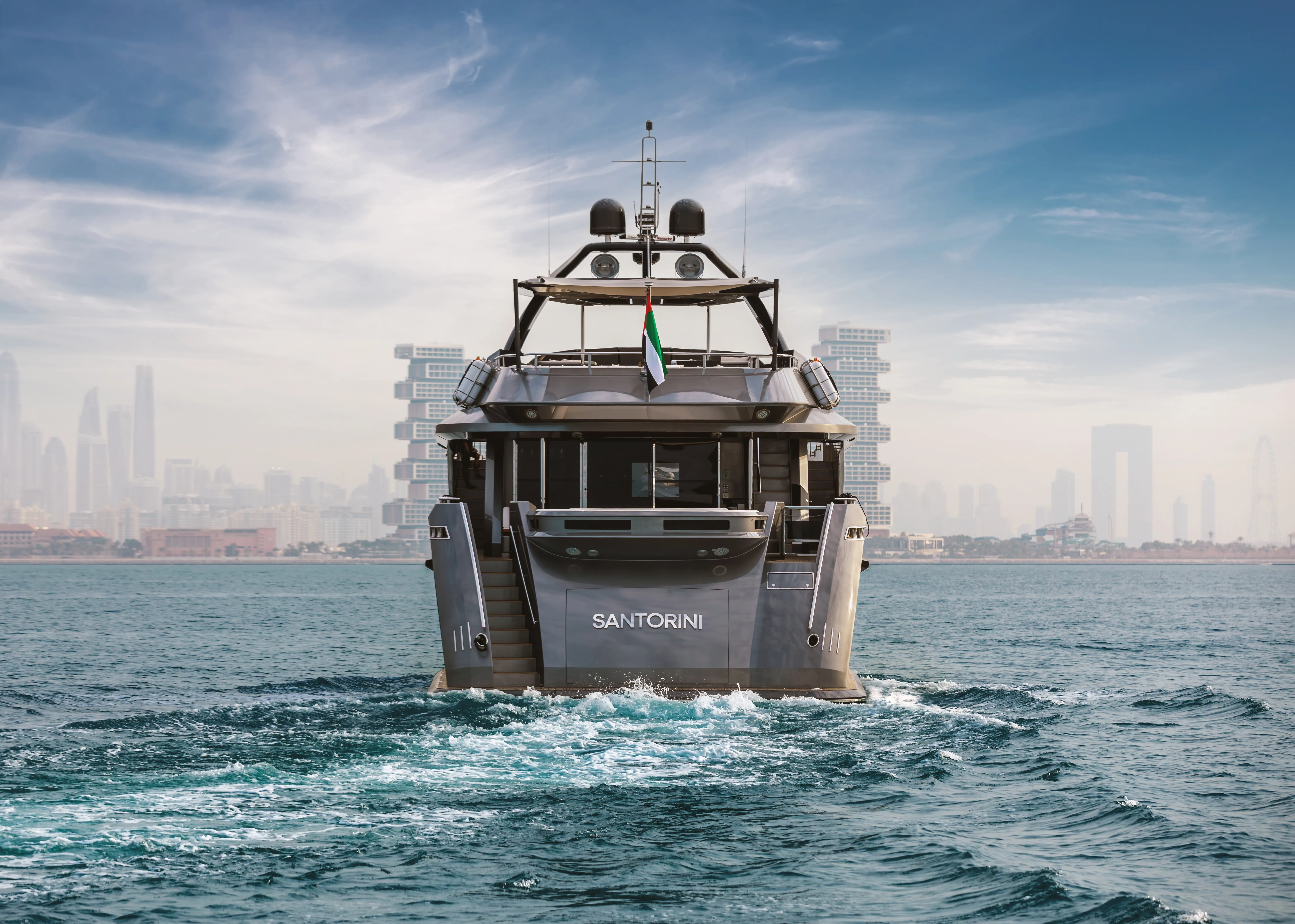 A masterpiece of craftsmanship, the Santorini Superyacht spans 115 feet of exquisite design and lavish comfort. Perfectly suited for luxurious charters in the Gulf region, she accommodates up to 50 guests for daytime excursions and offers overnight stays for 12, supported by a professional crew of 7. With spacious decks and elegant interiors, Santorini delivers an unforgettable yachting experience defined by grandeur and sophistication.